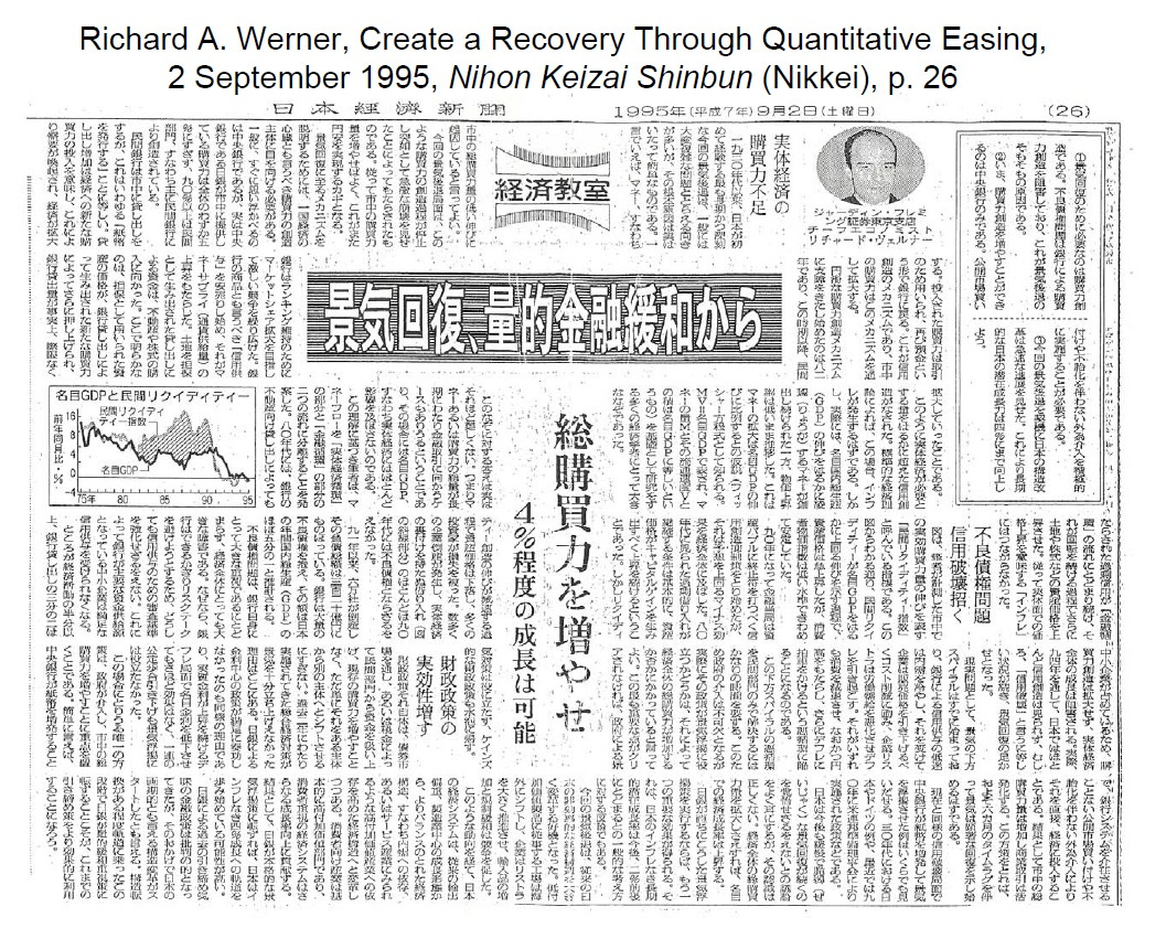 The name “Quantitative Easing” was based on the standard Japanese expression for stimulatory or expansionary monetary policy, which is usually called “easing” (緩和). But most economists were associating that general expression with interest rate reductions. However, I had found that interest rates (the price of money) were not the most important monetary policy transmission mechanism (see my more recent empirical work on this). Instead, it was the quantity of money, correctly measured as bank credit creation that determines economic growth (see my Quantity Theory of Disaggregated Credit e.g. here). To emphasise this quantity aspect, I simply positioned the word “quantitative” ahead of the standard easing expression, and “Quantitative Easing” was born, as published in the leading financial newspaper, the Nikkei (Nihon Keizai Shinbun, 日本経済新聞, whose owner today also owns the Financial Times), on 2 September 1995, and in a series of further articles in the Japanese media and client reports for Jardine Fleming Securities, Tokyo (where I worked as chief economist at the time).
